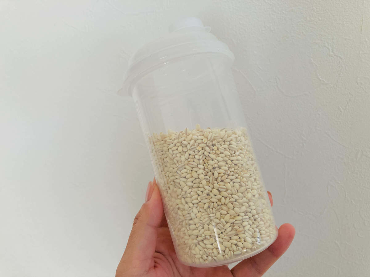 まかせてポットは540mlの大容量。玄米などの穀物の保存に最適でした。使うときはフタを開けて注ぐだけ。手作りドレッシングやソースの保存にもいいですね♪