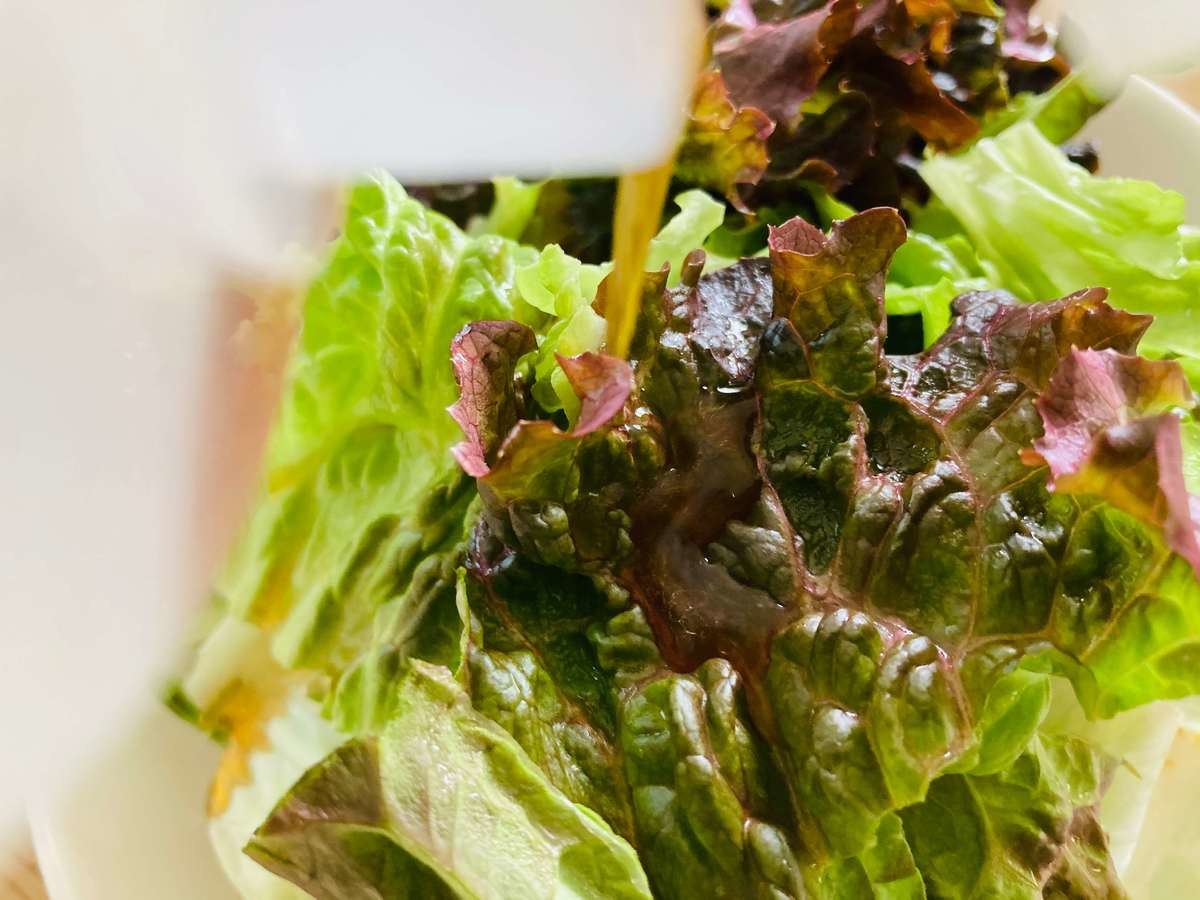 さっそくサラダにかけてみました。ポットの注ぎ口がちょうど良い大きさで、横にこぼれることもありませんでした!