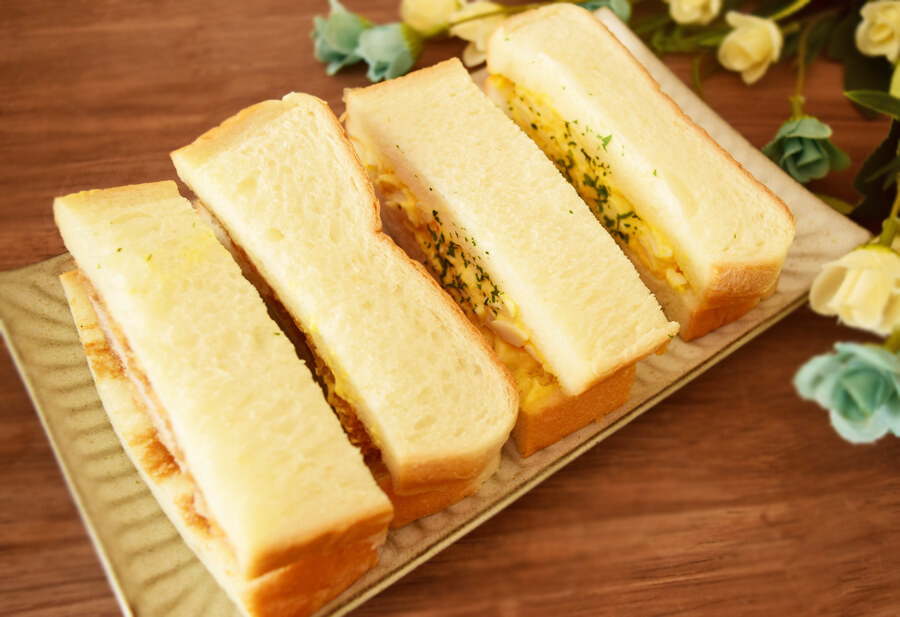 ヒレカツ・タマゴと各2カットずつ入っています。サンドイッチというと薄っぺらいサンドイッチ専用パンを使っているケースもありますが、ロピア「ヒレカツ&タマゴサンド」は食パン耳付きの厚めの生地なのが嬉しいポイント。