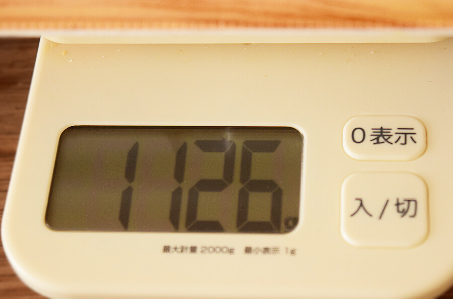 まずは、重さを測定。容器込みですが、なんと1126gもあります!メガ盛りをウリにしているショップに泣きが入っちゃいますよね。まさかスーパーでメガ盛り弁当が買えちゃうんですから……。