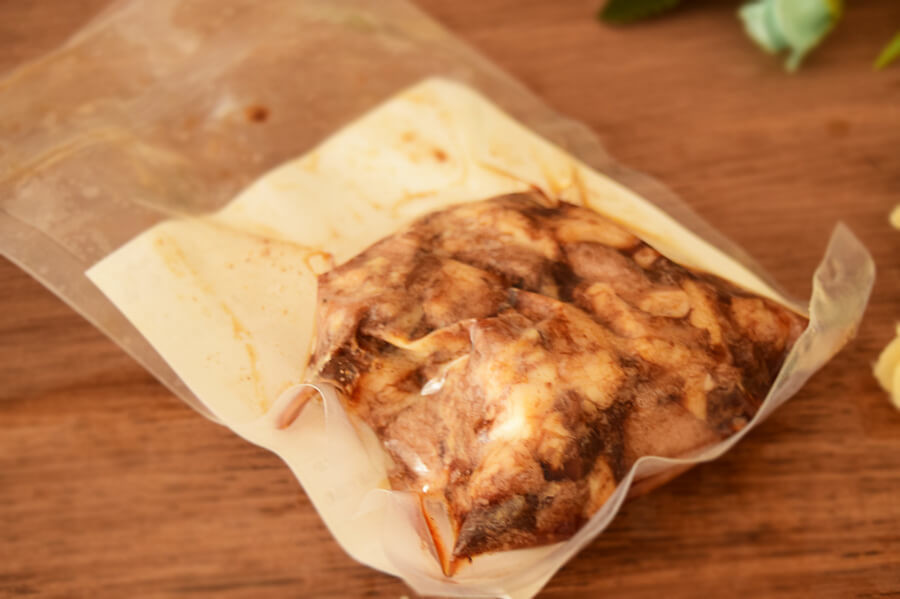 真空パックの中に、特製ダレで味つけされたサイコロチャーシューが60g入っています。量的には1人前といったところですね。