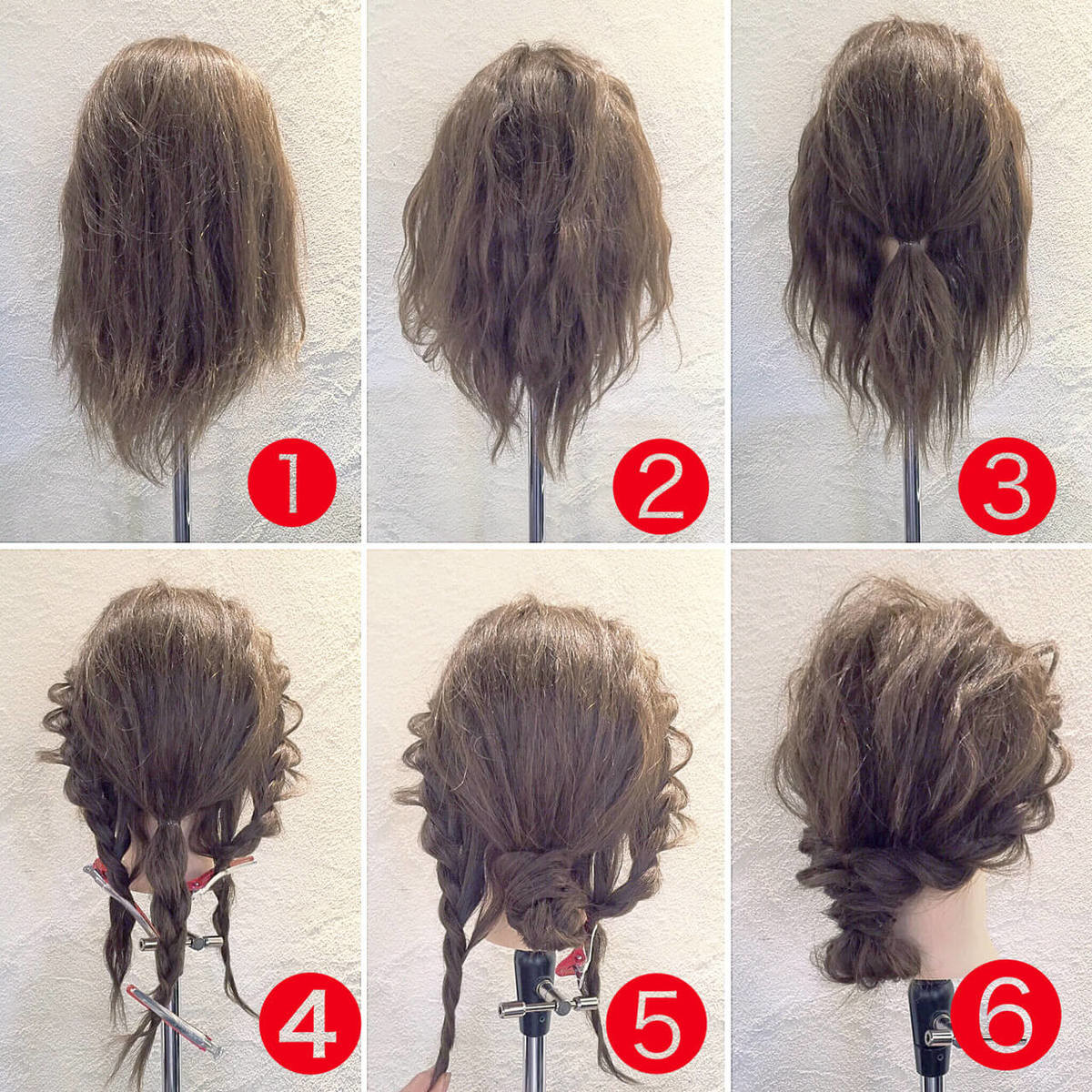 6~7:ひとつの毛束をねじりながら結び目に巻きつけ、もう1束も根元に巻きつけピンで固定
