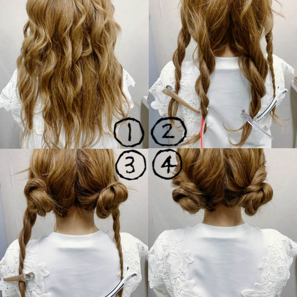 1:後ろを左右に分けてサイドを三つ編みして後ろで交差させそれぞれ結び「くるりんぱ」する