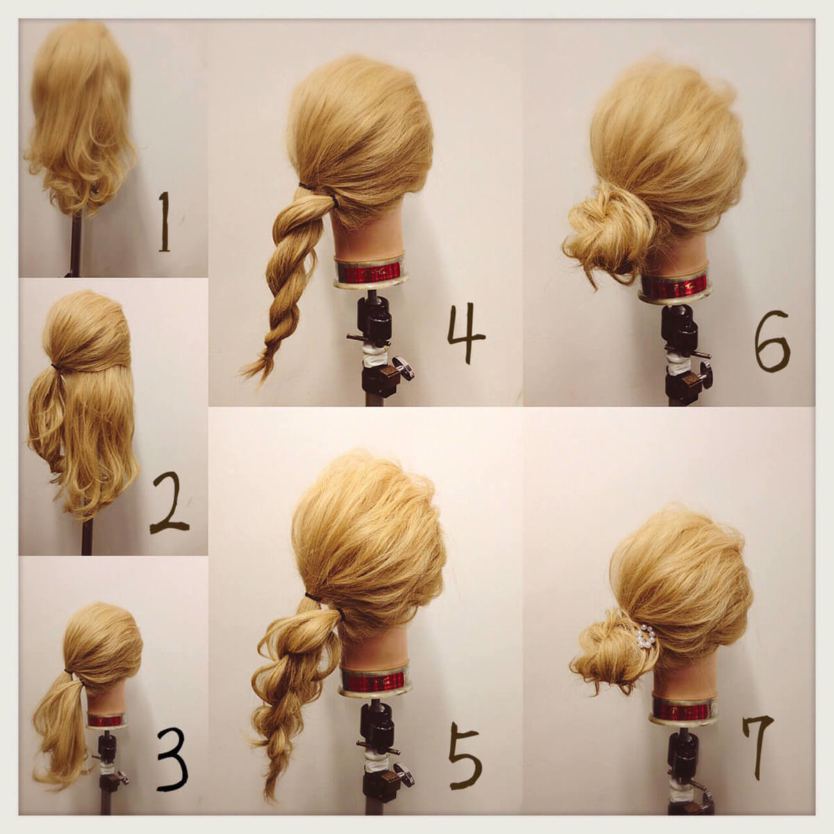 5:三つ編みした③の毛先を根元に巻き、お団子にしてピンで留める