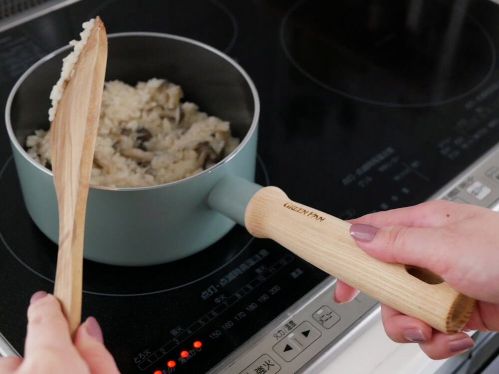 そして本体の色合いとぴったりの優しく明るい木製ハンドル。 耐久性が高いので熱くならず、握りやすいという点もまた魅力のポイント。 しかも、使えば使うほど風合いが豊かになり、天然木ならではの木目の変化もお楽しみいただけるんです。