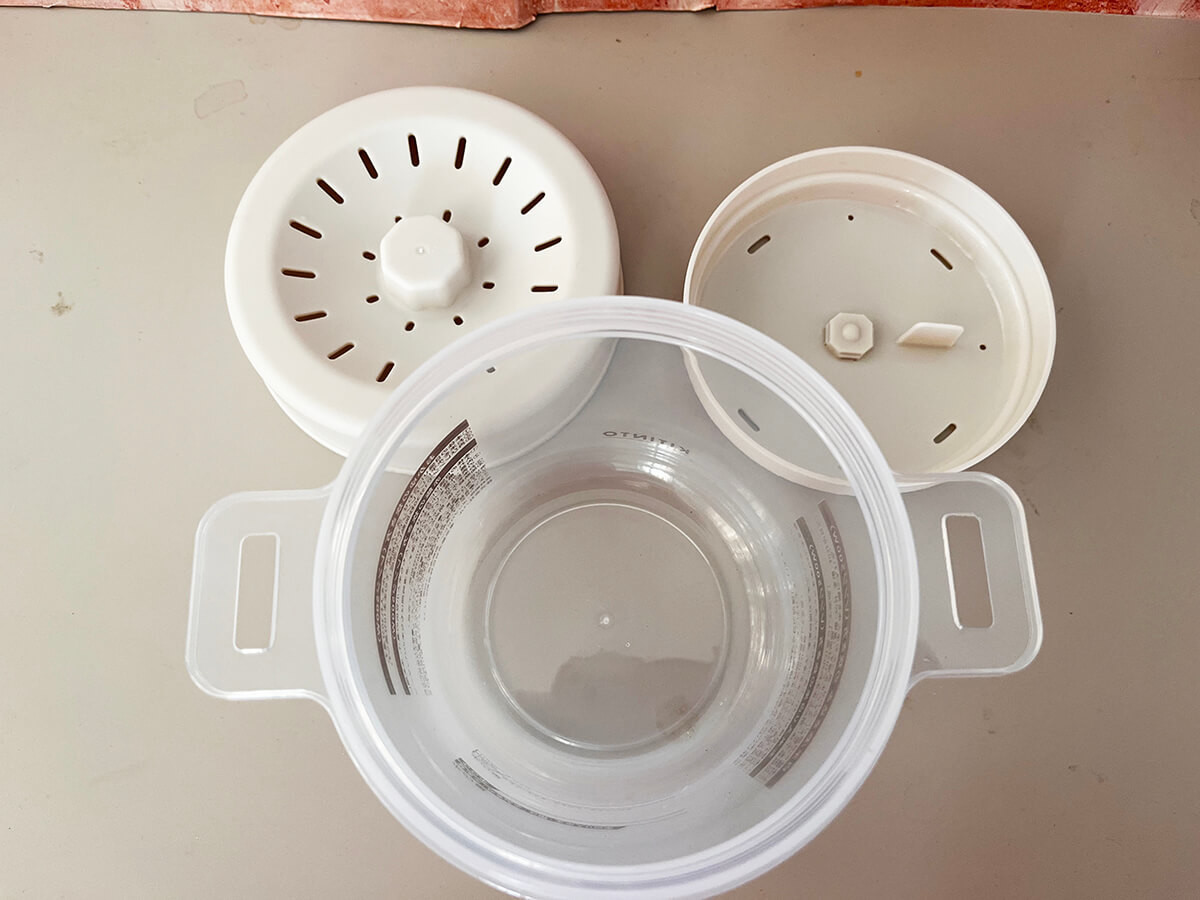 3COINSの公式サイトによると、素材はポリプロピレンで、サイズはおよそ幅17.3cm×直径12.8cm×高さ12cm、容量は約900mlで耐熱温度120℃、耐冷温度-20℃となっています。直火にかけての使用や、食器洗浄機の使用は不可となっています。そして蓋は、写真のように2重構造になっています。