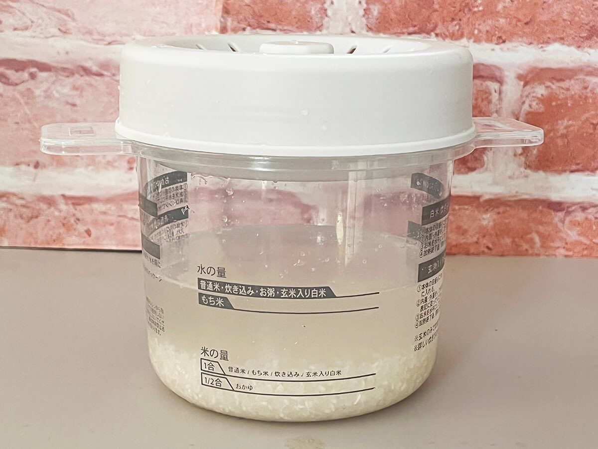 では解説書に従って、実際にご飯を炊いてみましょう。まずは洗った米を1合分中に入れます。米や水の量は容器に線で示されていてそれに従うだけなので、1人暮らし初心者のようにお米を炊くのに不慣れな人でも失敗する心配がありません。