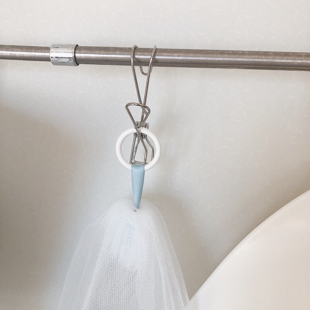 フックをタオルバーに引っ掛けて、ピンチで泡立てネットをはさんでつるしたり...、