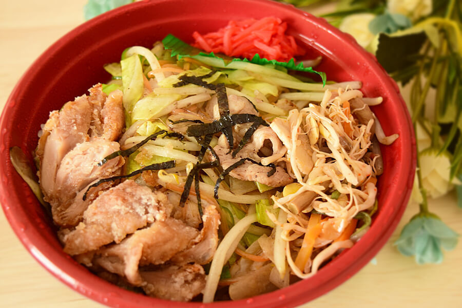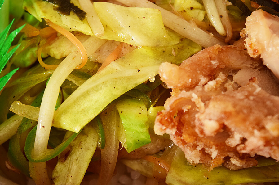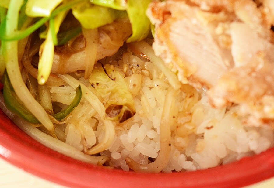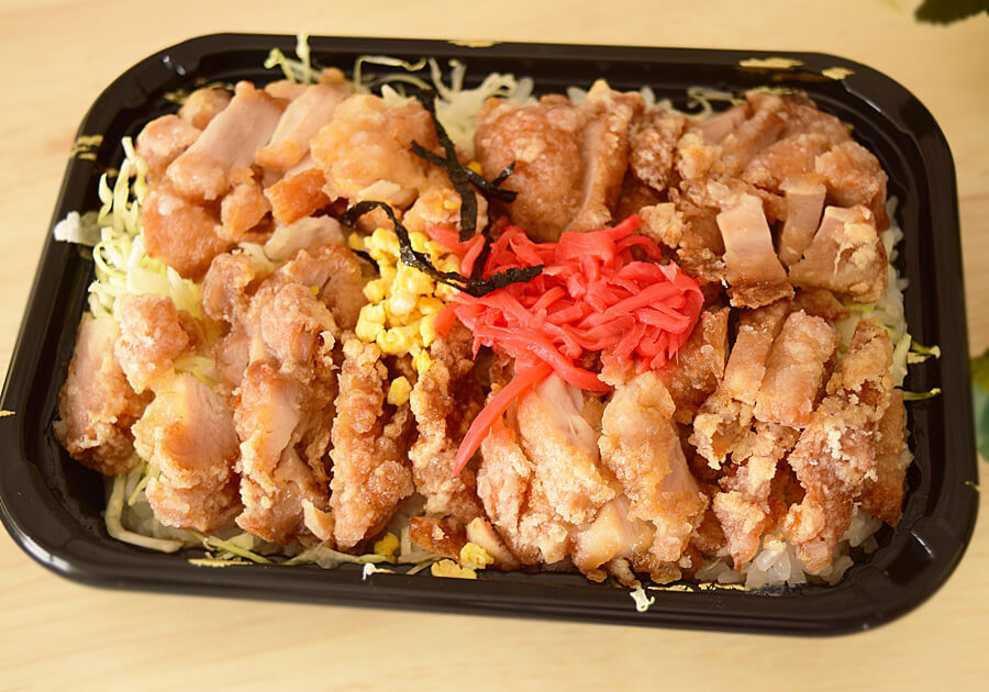 ええっと、ごはんのうえに千切りキャベツ、その上に唐揚げがいっぱい敷き詰められており、そぼろ上のたまごと紅しょうが、きざみのりがかかっていますね。
