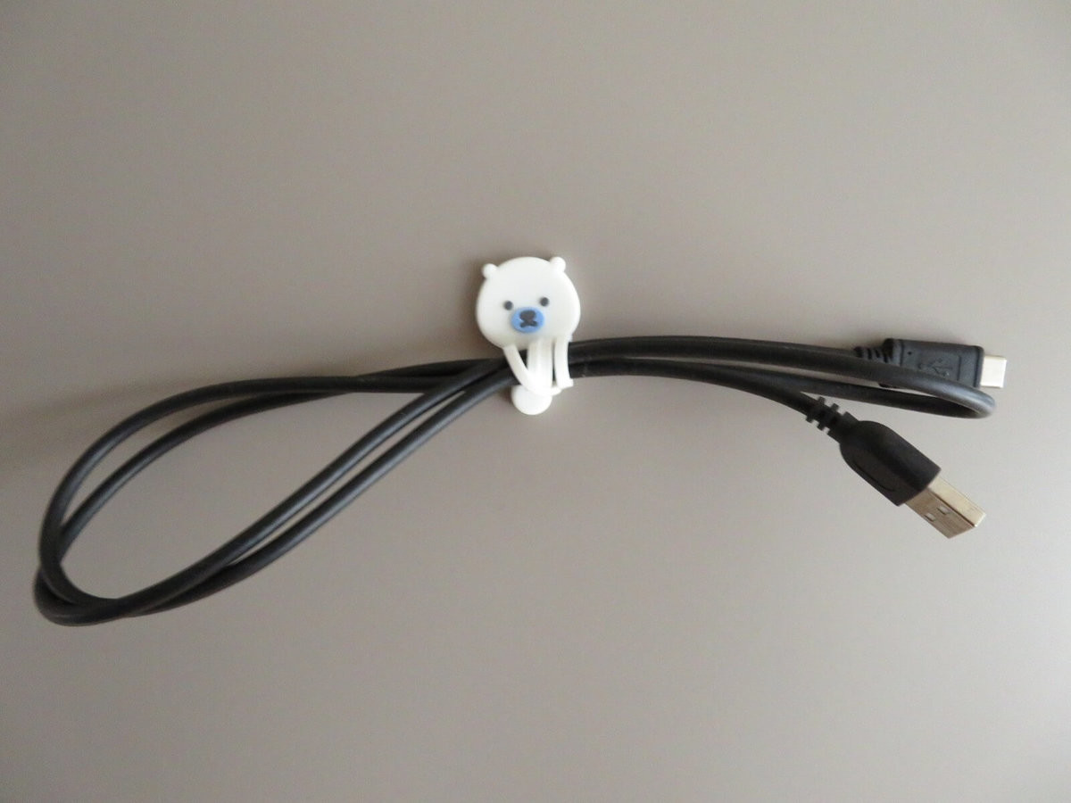 ケーブルにグルグルと何回か巻きつけたら、輪っかにクマの顔を通して固定させます。