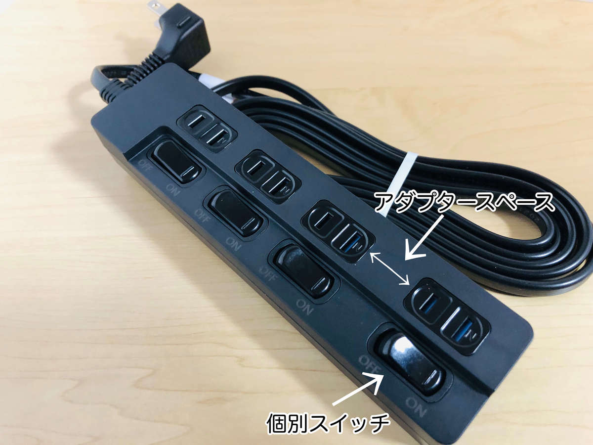 4個口の節電タップには、アダプタースペースが1箇所あります。大きいACアダプターもらくらく接続可能です。
