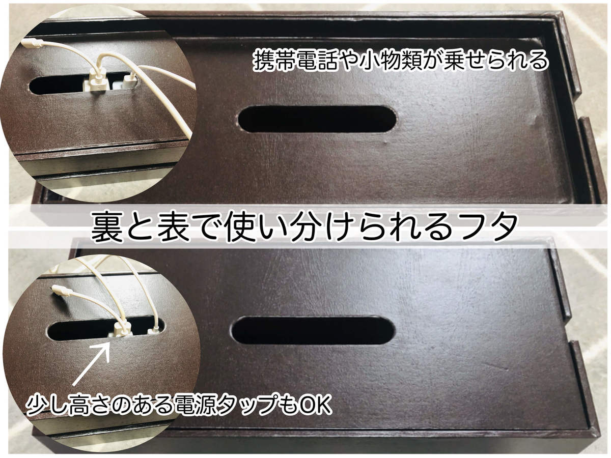 コードをフタの上部から出したい時は、約10cmほどの穴を通します。フタは裏表、両面使えるので携帯電話や小物類の置き場所としても使えますよ。