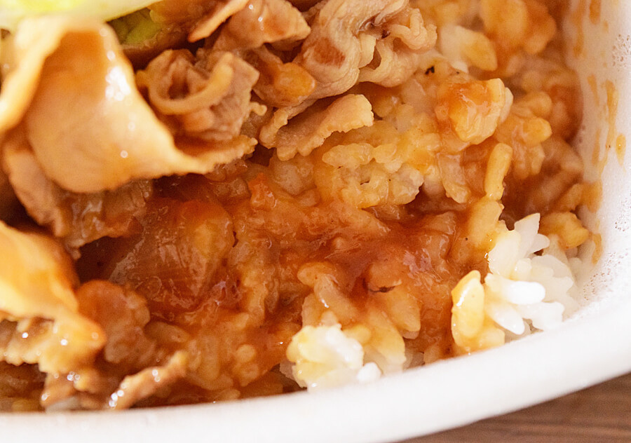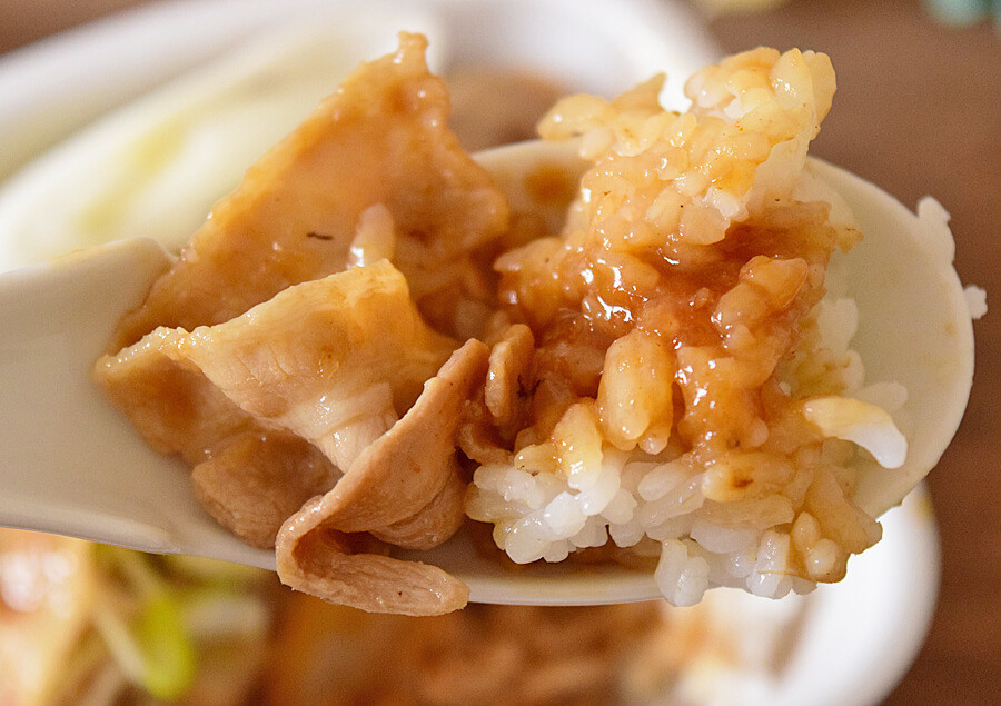 ふと、ごはんに目を向けると、醤油と生姜で味つけされた特製ダレが染み込んでいます。「ごはんと豚肉を一緒に食べたらガツンとくるかな」と、ごはんと共に豚肉を食べてみると……