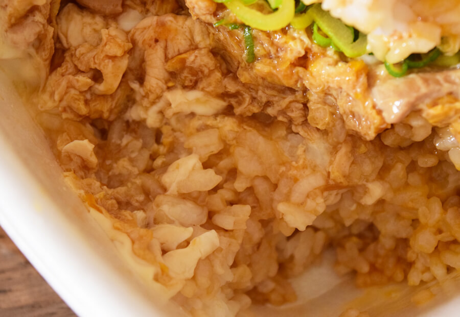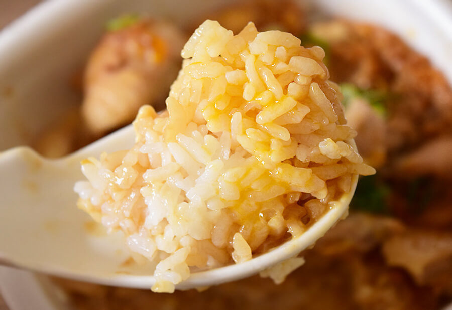 むしろ、ごはんだけ食べてもおいしい。ごはんにも液体状にとろけたたまごが下まで染みてるんですよね。