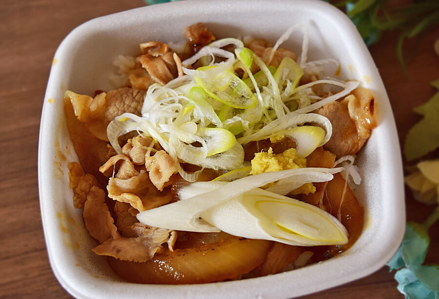 丼と定食の違いですが、丼は豚の生姜焼きがごはんの上にのっている一品であり、定食はご飯・みそ汁・ミニサラダ付きでご飯の増量・おかわりは無料。お持ち帰りは不可とのことでした。