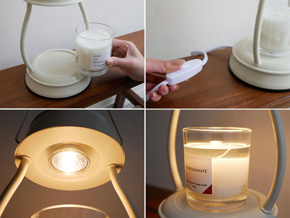 さらに、火を使うとキャンドルは溶けたロウが炎の熱で気化し減ってしまいますが、ハロゲンライトの熱でキャンドルを溶かす「キャンドルウォーマー」なら、ロウが気化しないのでお気に入りのロウソクが減らないのも嬉しいポイント。