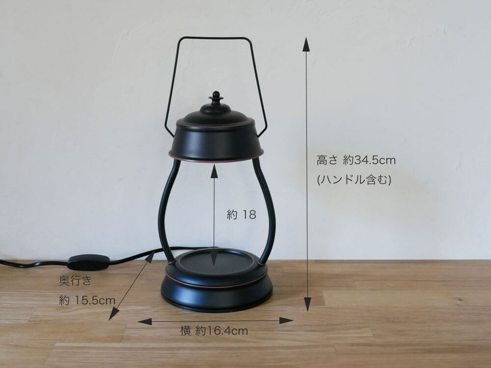 本体のサイズは横16.4×奥行15.5×高さ34.5cm(ハンドル含む)。 キャンドルを置く台の内寸は約9.5cm、ライトからキャンドル台までの高さは約18cm。