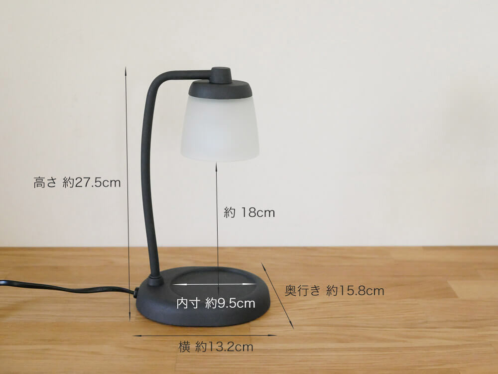本体のサイズは横13.2×奥行15.8×高さ27.5cm。 キャンドルを置く台の内寸は約9.5cm、ライトからキャンドル台までの高さは約18cm。