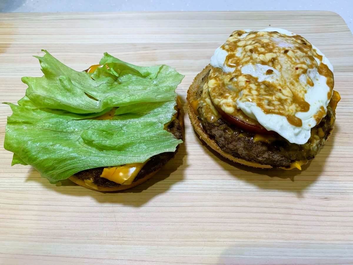 ここで目玉焼きを作りましょう。しっかり焼くよりも半熟くらいで焼くと、まるで月見バーガーのようになっておすすめ!