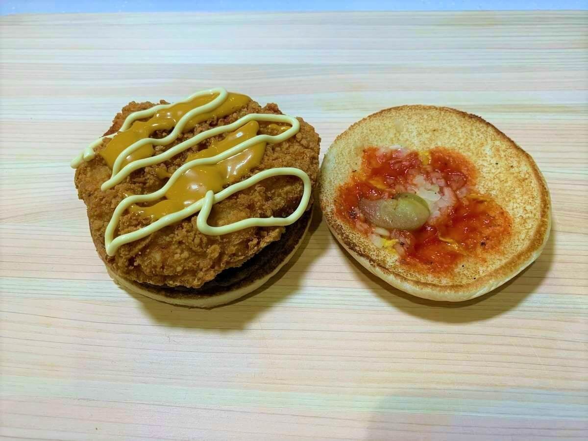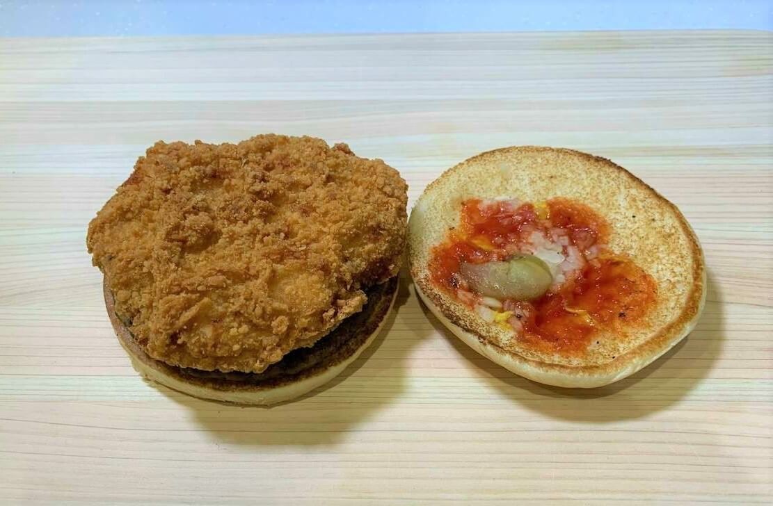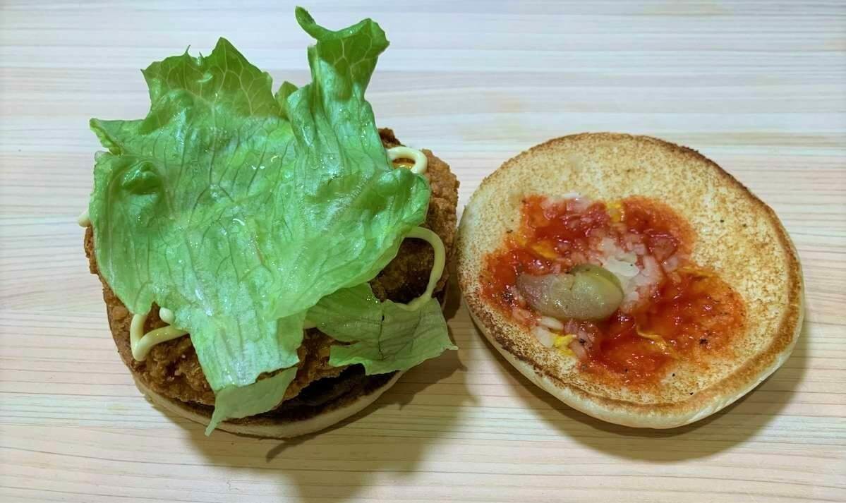 ハンバーガーの上のバンズを外して、シャカチキをのせます。