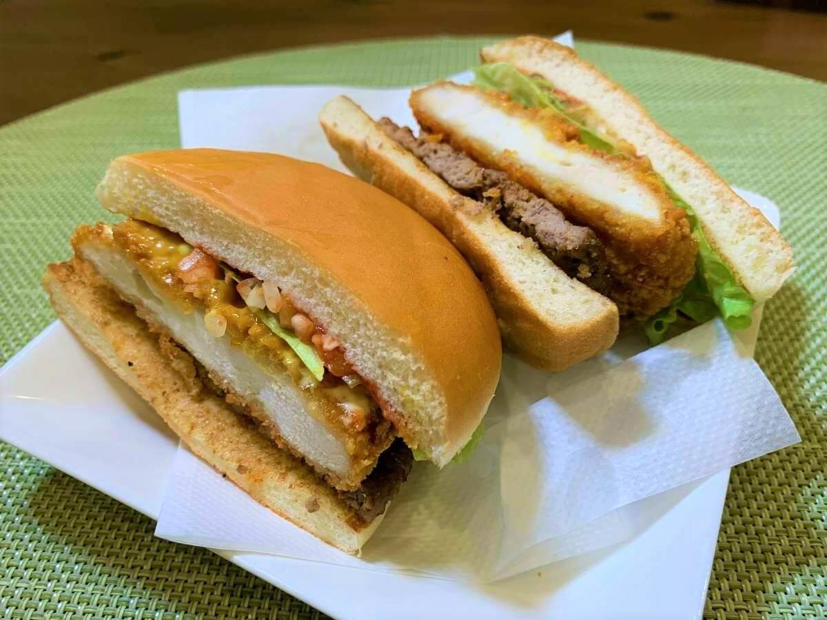 食べてみると、チキンとビーフパティの旨味が同時に楽しめて、めちゃくちゃ美味しい。マスタードソースとマヨネーズもハンバーガーと相性◎です。自分で自分を褒めたい気分ですね(笑)。