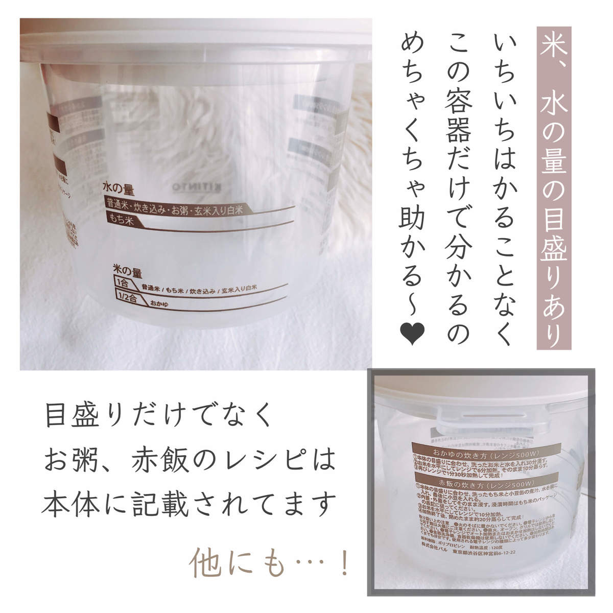 米・水のメモリが容器にあるので、いちいち量ることなくこの容器だけで分かるのも、とてもありがたいんです。
