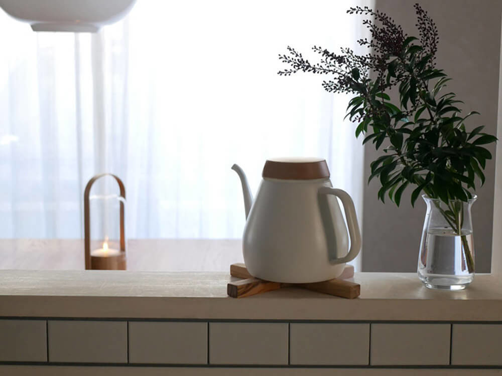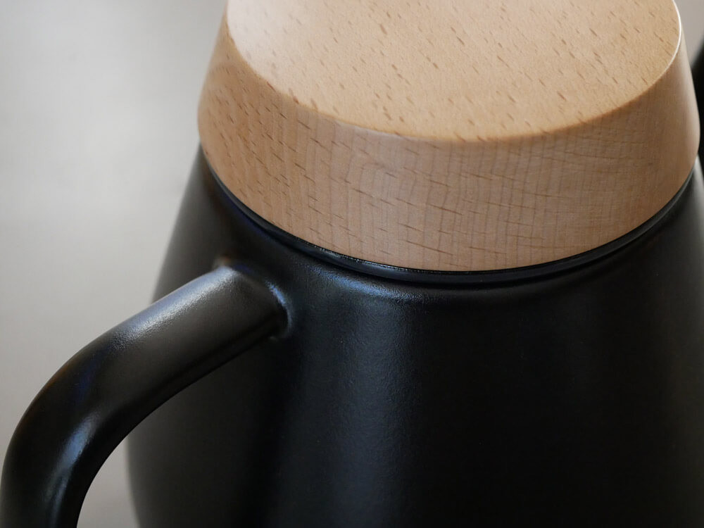 蓋はブナ材を使用し、温かみのある印象に。 コーヒーやお茶、紅茶などそのひと息にマッチする、優しい時間を提供してくれます。