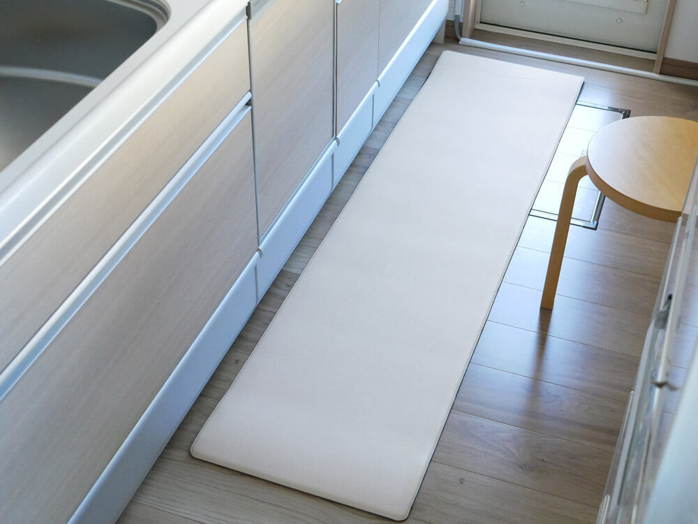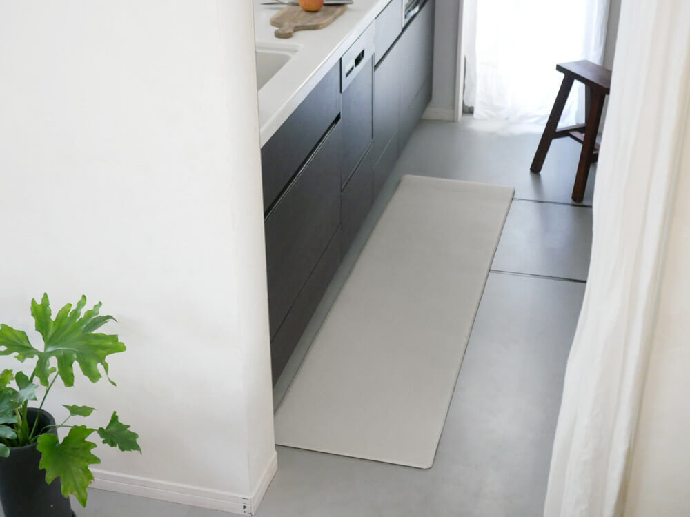 8mm厚のぷにぷに触感の「キッチンマット」。クッション性があるので足腰への負担を軽減!さらに撥水効果もあるので濡れてもサッと拭き取れ、いつでも綺麗なキッチン空間に。