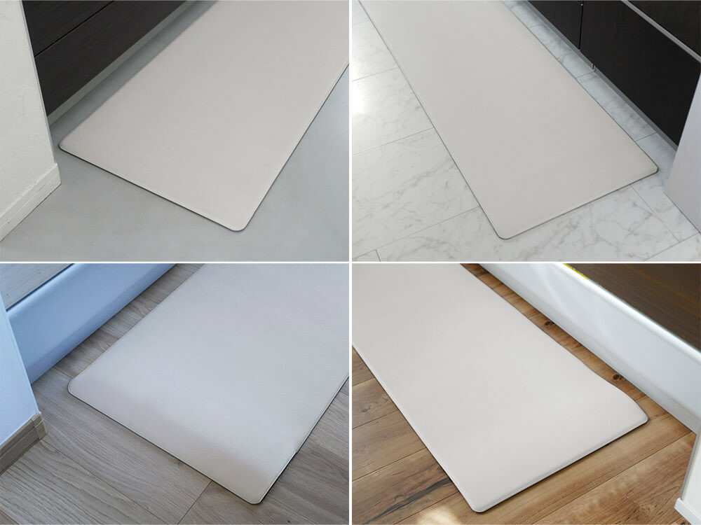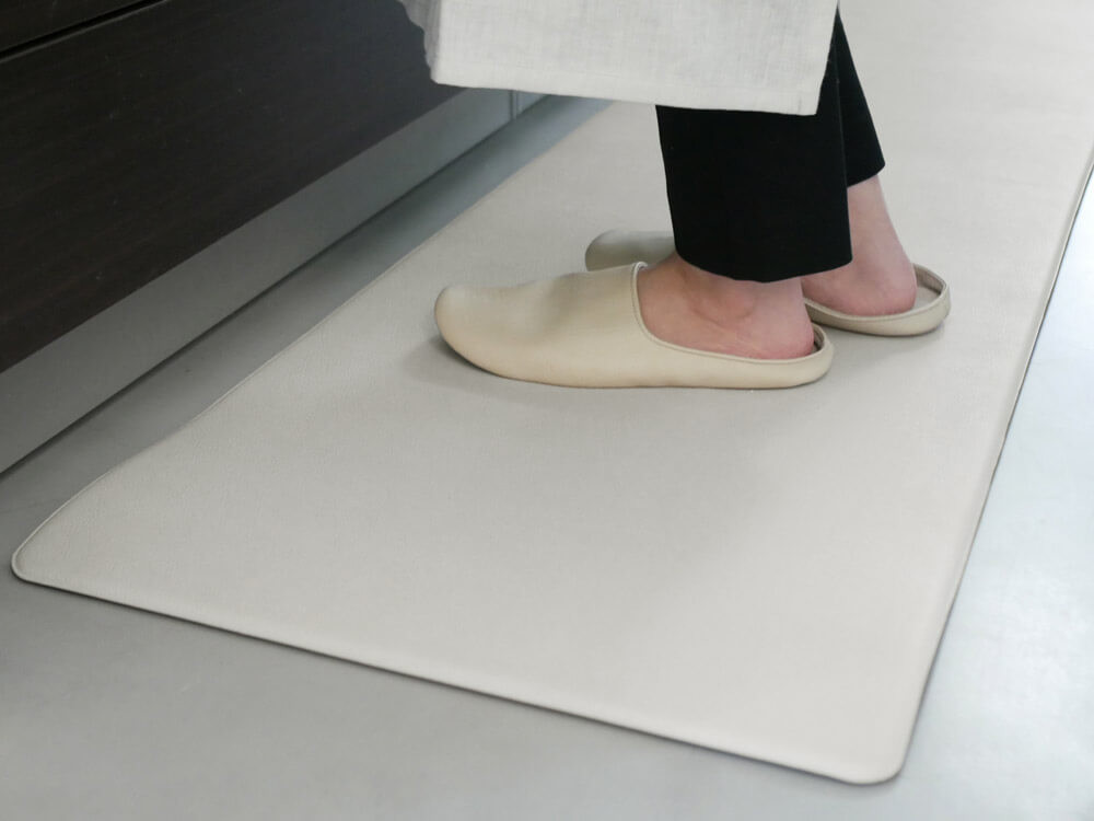 マットの厚みは約8mmと肉厚。 お料理や食器洗いでの立ち仕事でも足腰が痛くなりにくく、踏み心地もぷにぷにでちょっとクセになりそう♪ 冷たく硬い床で家事をやるより断然快適です。