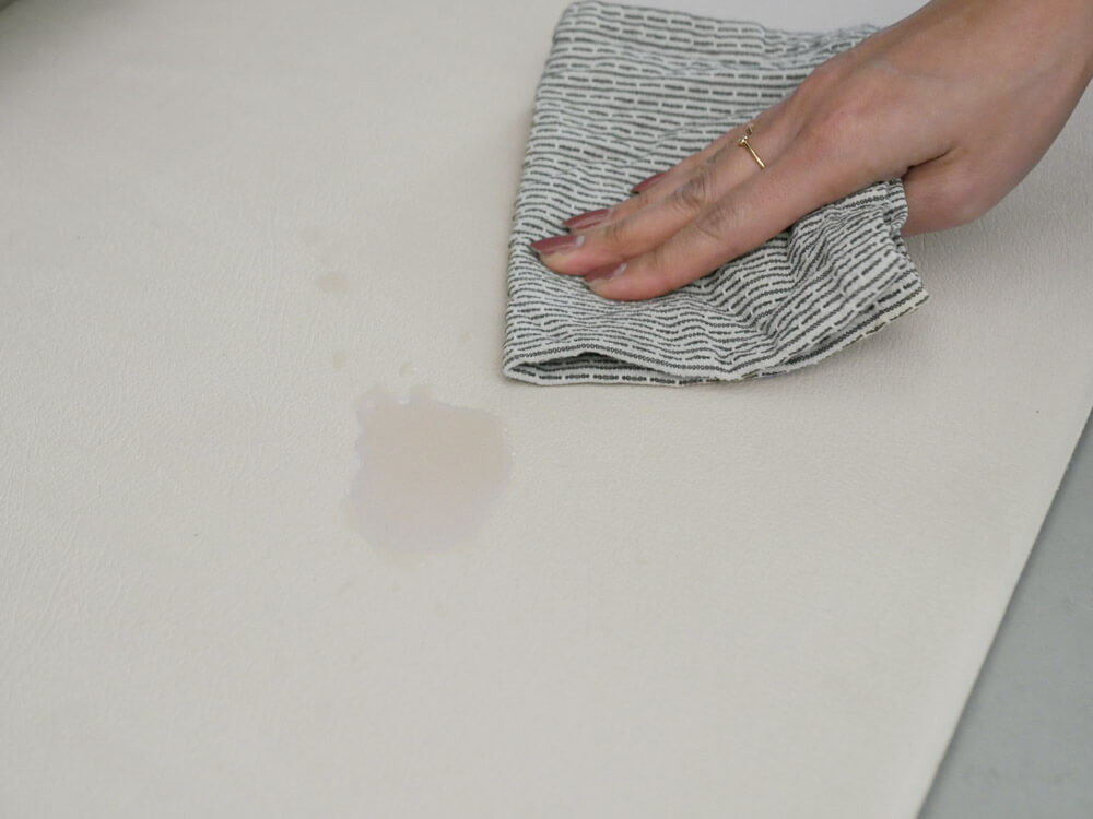 「【OKATO】拭けるキッチンマット」はそんな汚れもサッとひと拭き! 撥水効果があるので、濡れてしまっても綺麗に拭き取れるんです。
