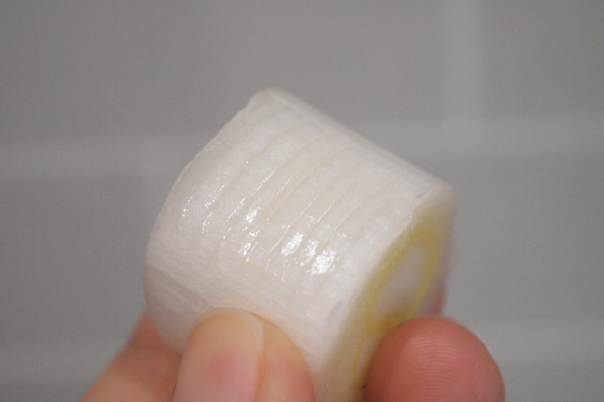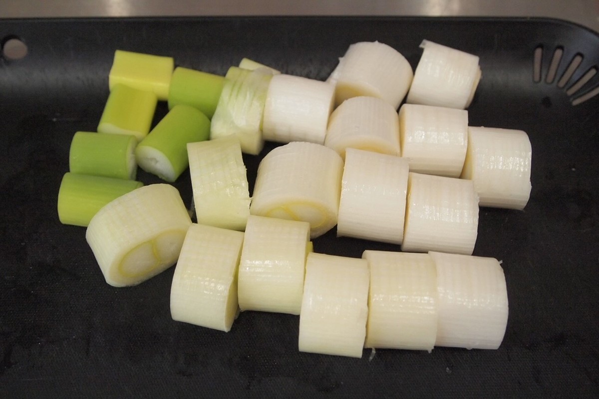長ネギは、繊維を断ち切るように、上下両面に1mm幅に浅く切り目を入れ、2cmの長さに切ります。