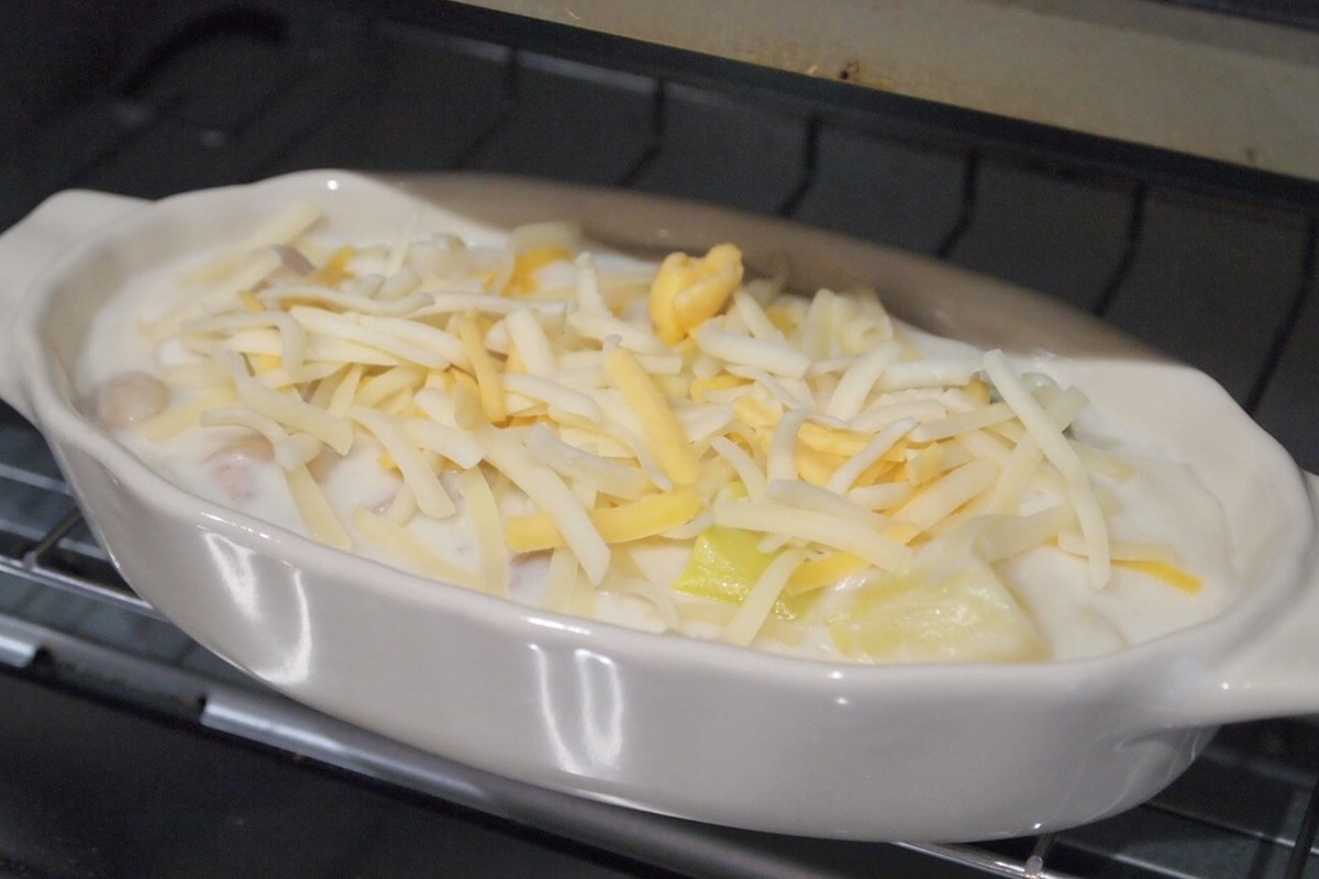 作り方⑤グラタン皿に入れチーズをのせて焼く。