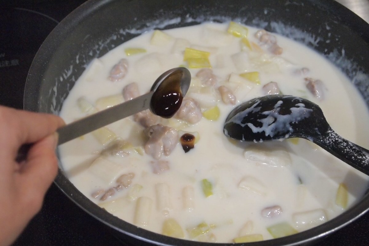 3分程焦げないように煮込み、鍋底にへらで線がかける程度にとろみがついたら、オイスターソースと塩で味つけをします。