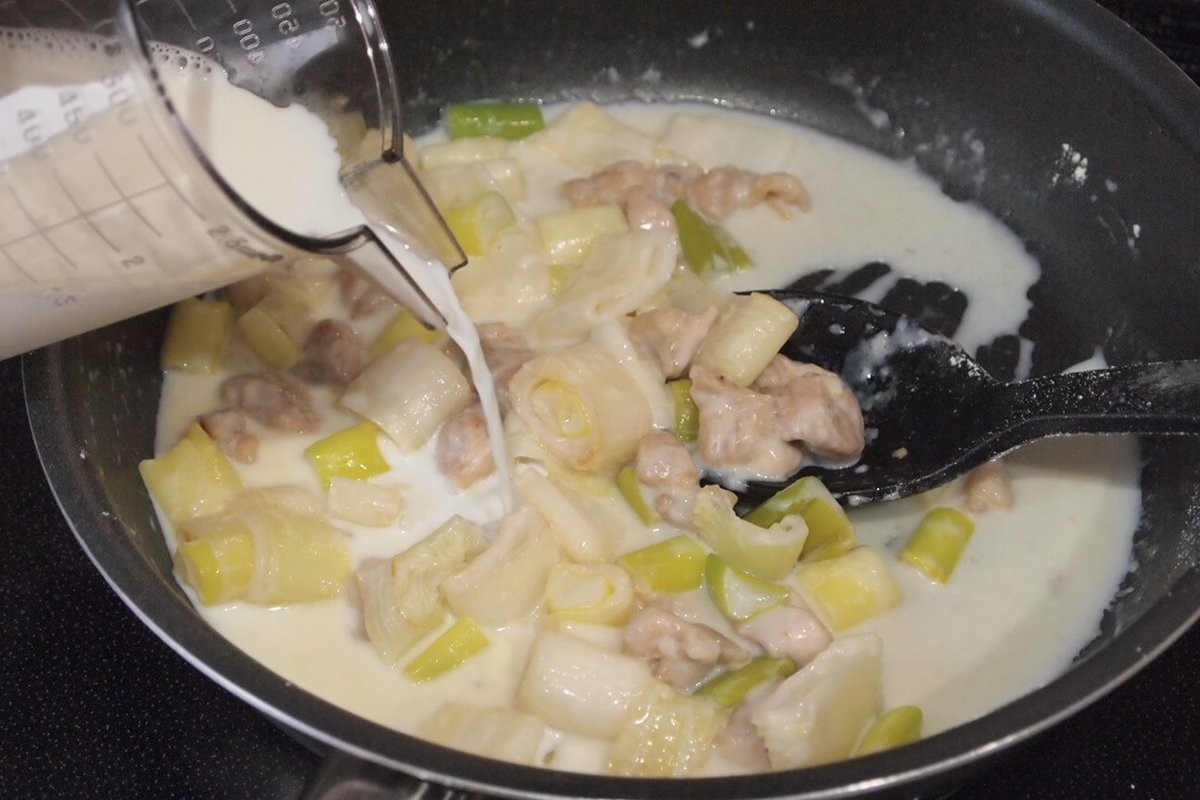 長ネギがしんなりと柔らかくなったら、小麦粉をふり入れて炒めます。そこに少しずつ牛乳を加えてとろみをつけていきます。