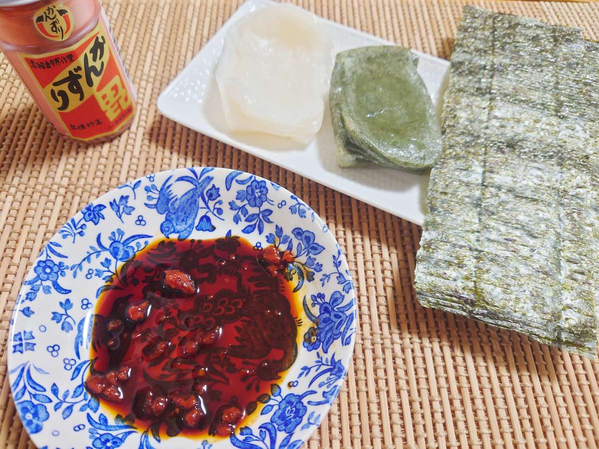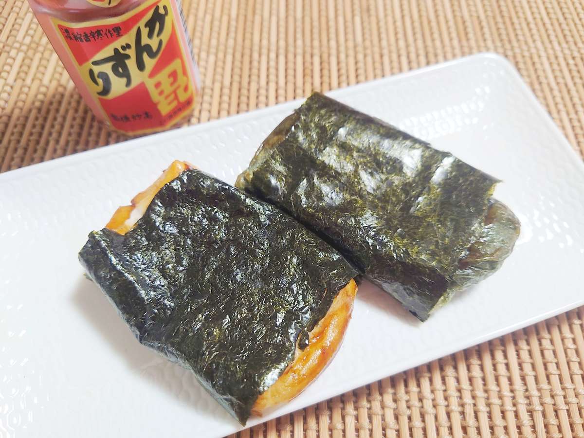 海苔で巻いてしっとりしたところをいただきました。ピリ辛柚子しょうゆ味になり、おいしいです。