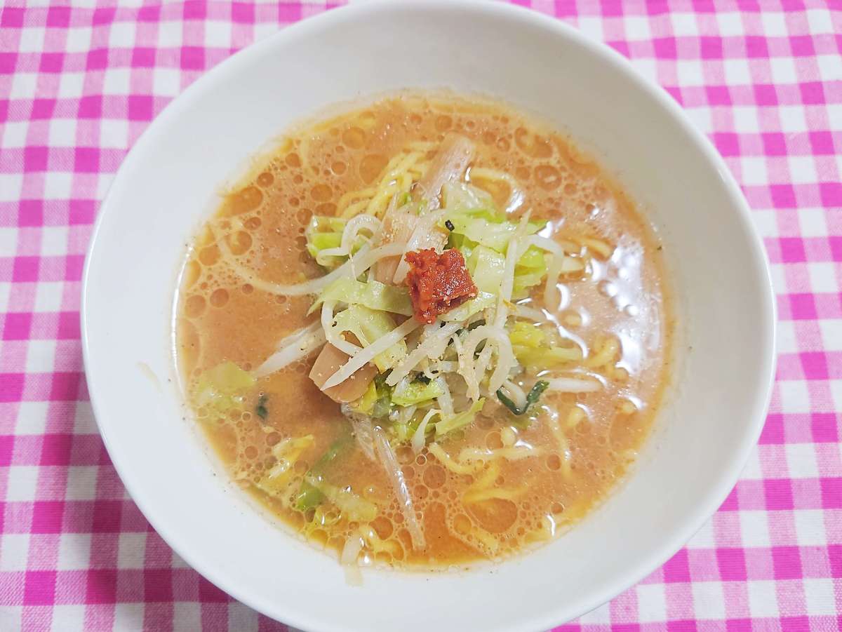 インスタントの味噌ラーメンに、キャベツともやしメインの野菜炒めをオン、さらにかんずりを乗せれば、ピリッとしまるワンラク上の味になりました!