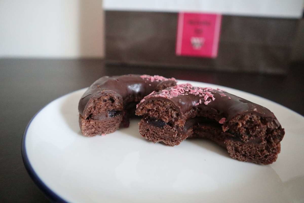 ショコラ生地のドーナツにブルベリージャムとガナッシュクリームの2種類をサンドしています。こちらは“プラリネショコラのミルティーユ”をイメージしたそうです。フレッシュなフランボワーズの香りがはじけます。甘く濃厚なチョコレートのドーナツに爽やかなベリーが加わりとてもバランスがとく上品でリッチな味わいです。