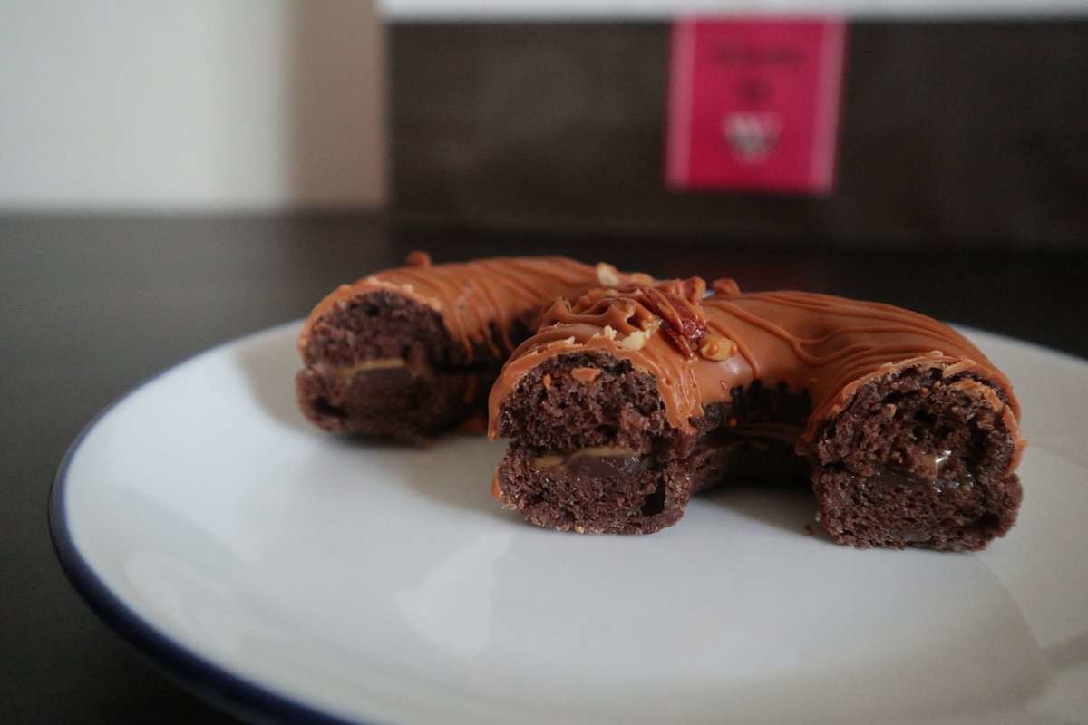 ショコラ生地のドーナツにキャラメルモカクリームとガナッシュクリームの2種類をサンドしています。ヴィタメールの代表作“プラリネショコラのマロー”をイメージしたドーナツです。ほろ苦くカラメリゼされたナッツと濃厚なキャラメルの相性が抜群です。この美味しさふが200円台なんて信じられない!