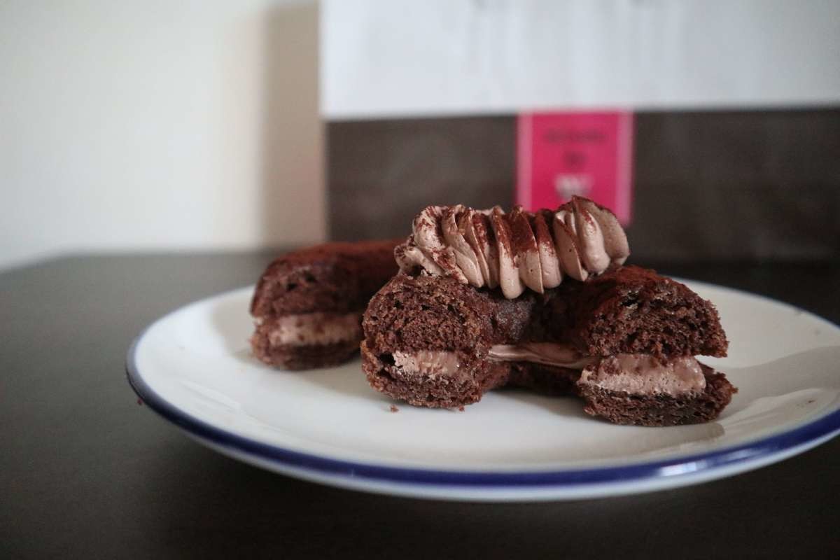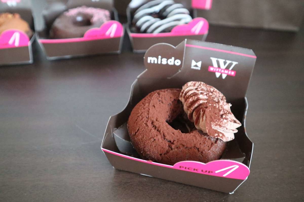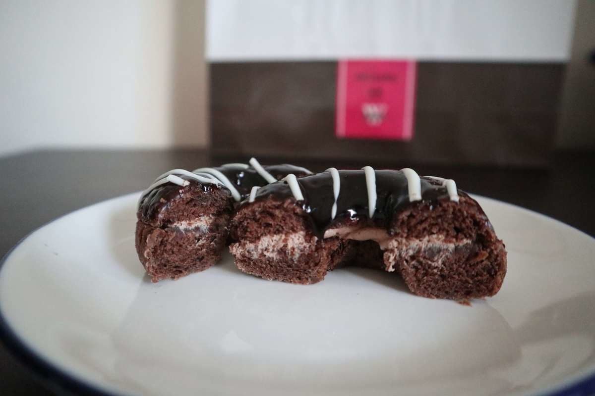 ショコラ生地のドーナツにガナッシュクリームとガナッシュホイップの2種類がサンドされています。チョコレートナパージュがコーティングされて、ホワイトチョコがかけられています。これでもかというくらいチョコ尽くしでチョコ好きにはたまりません!濃厚なチョコの味わいを楽しめます。