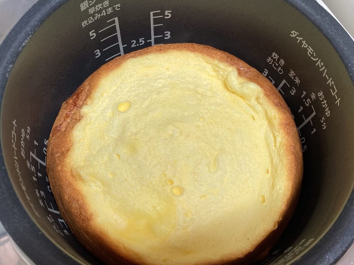 メレンゲと卵黄生地を合わせて混ぜすぎたのか、それとも単純に炊飯器との相性の問題なのか…。