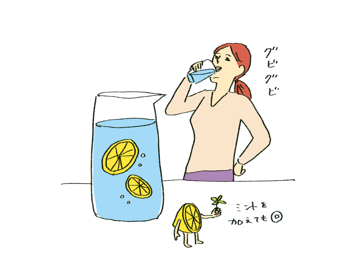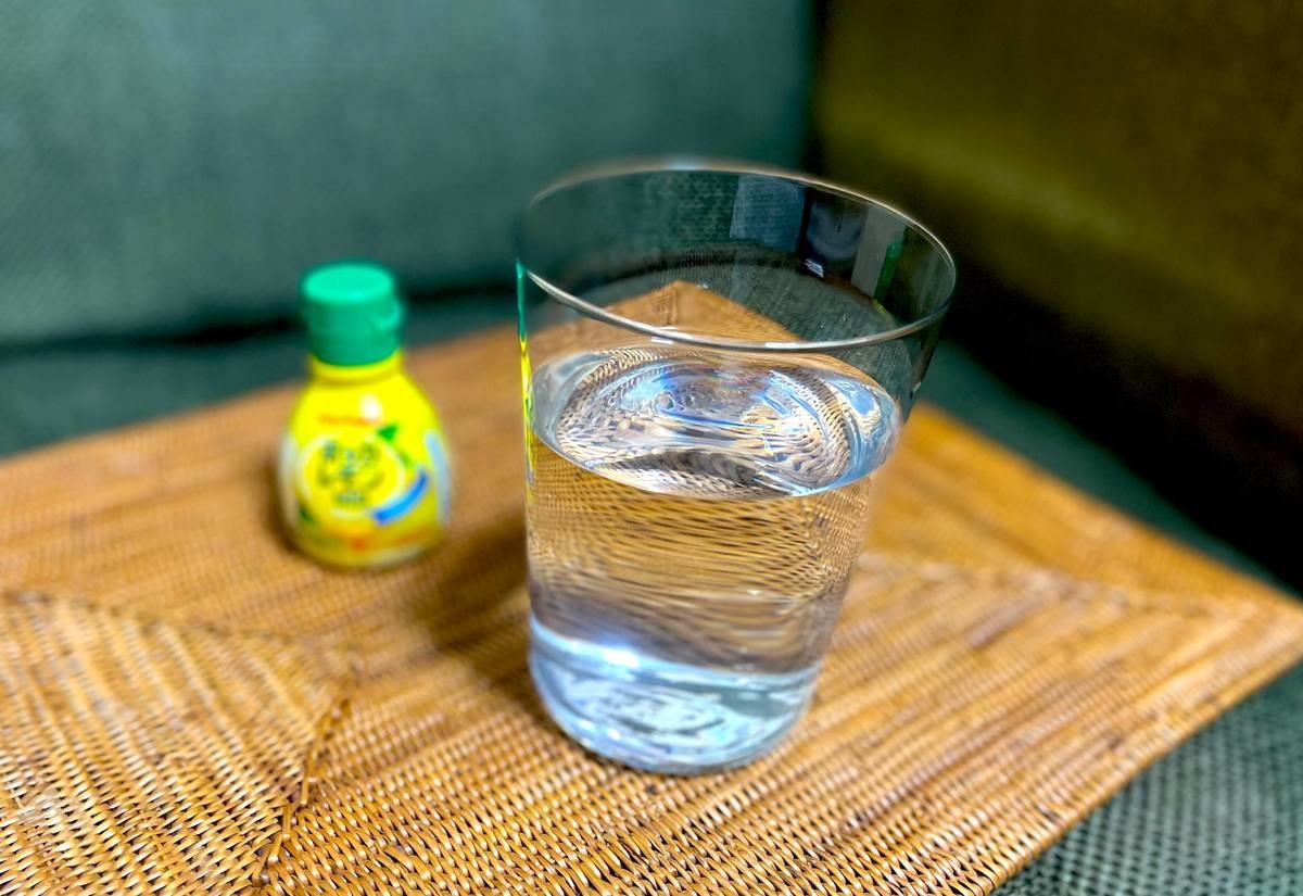 作り方はコップ1杯の水にレモン汁大さじ1が目安。今回は手軽な市販のレモン果汁を利用しました。