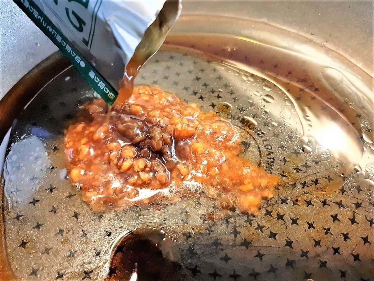 水180mlを入れたフライパンに、付属のソースを入れます。ドロドロとした液体がでてきました。既になんだかいい香りもします。