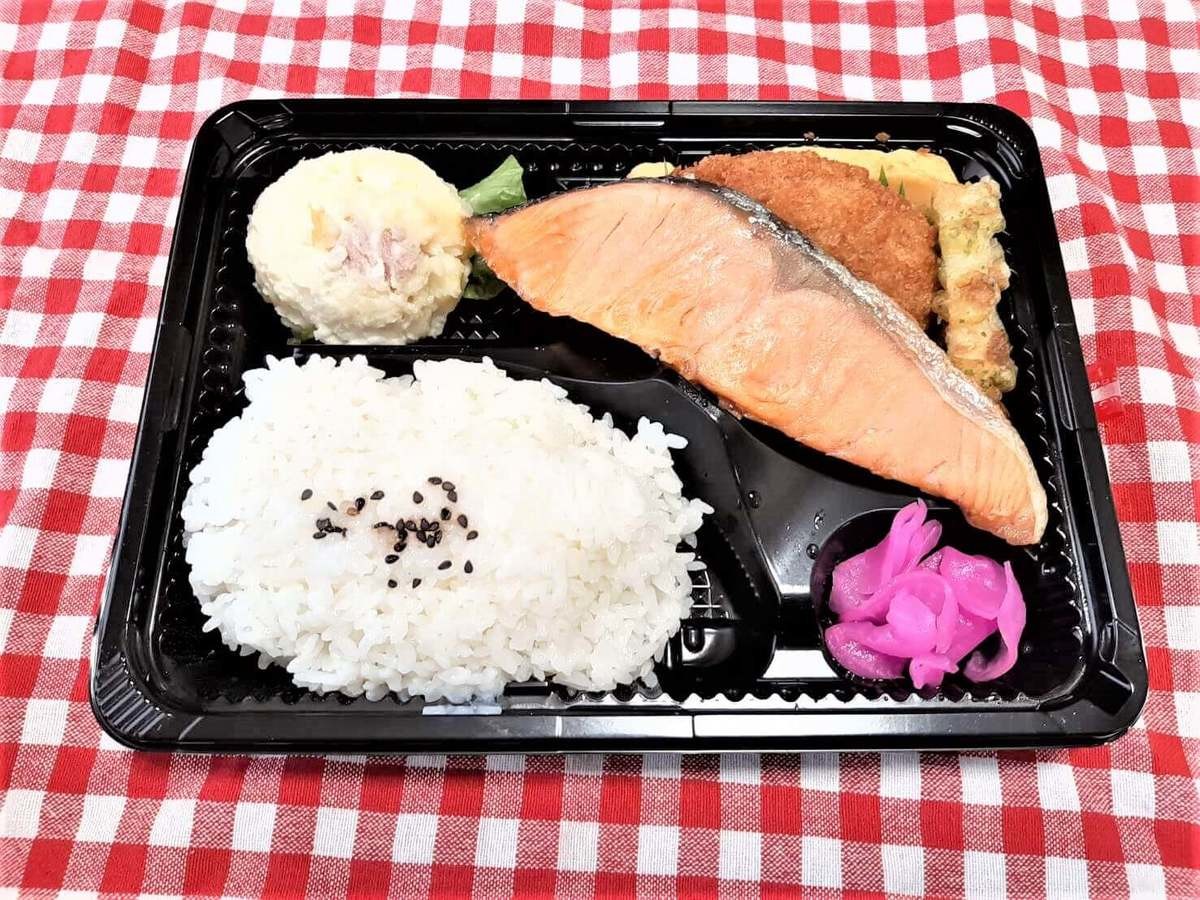塩気のある焼鮭、甘い卵焼き、控えめな甘味を感じるコロッケなどいろいろなおかずが楽しめる一品です。