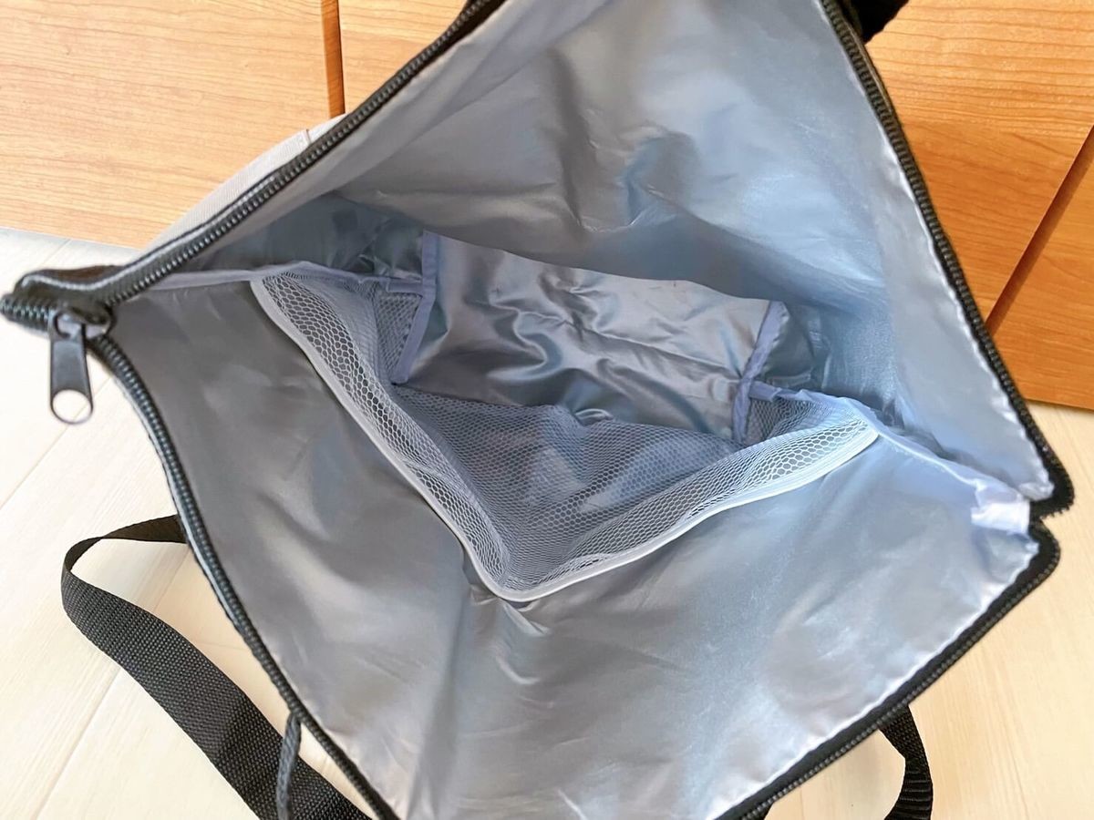サイズも大きく、マチもしっかりあるので、かなりたくさん入りますよ。内側にはメッシュポケット付き。
