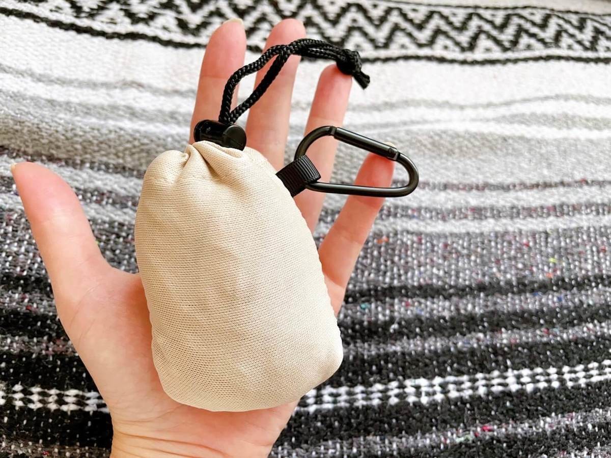 本当に楽ちん!また、手のひらサイズでとってもコンパクトなのに、広げるとこんなに大きなエコバッグになります。