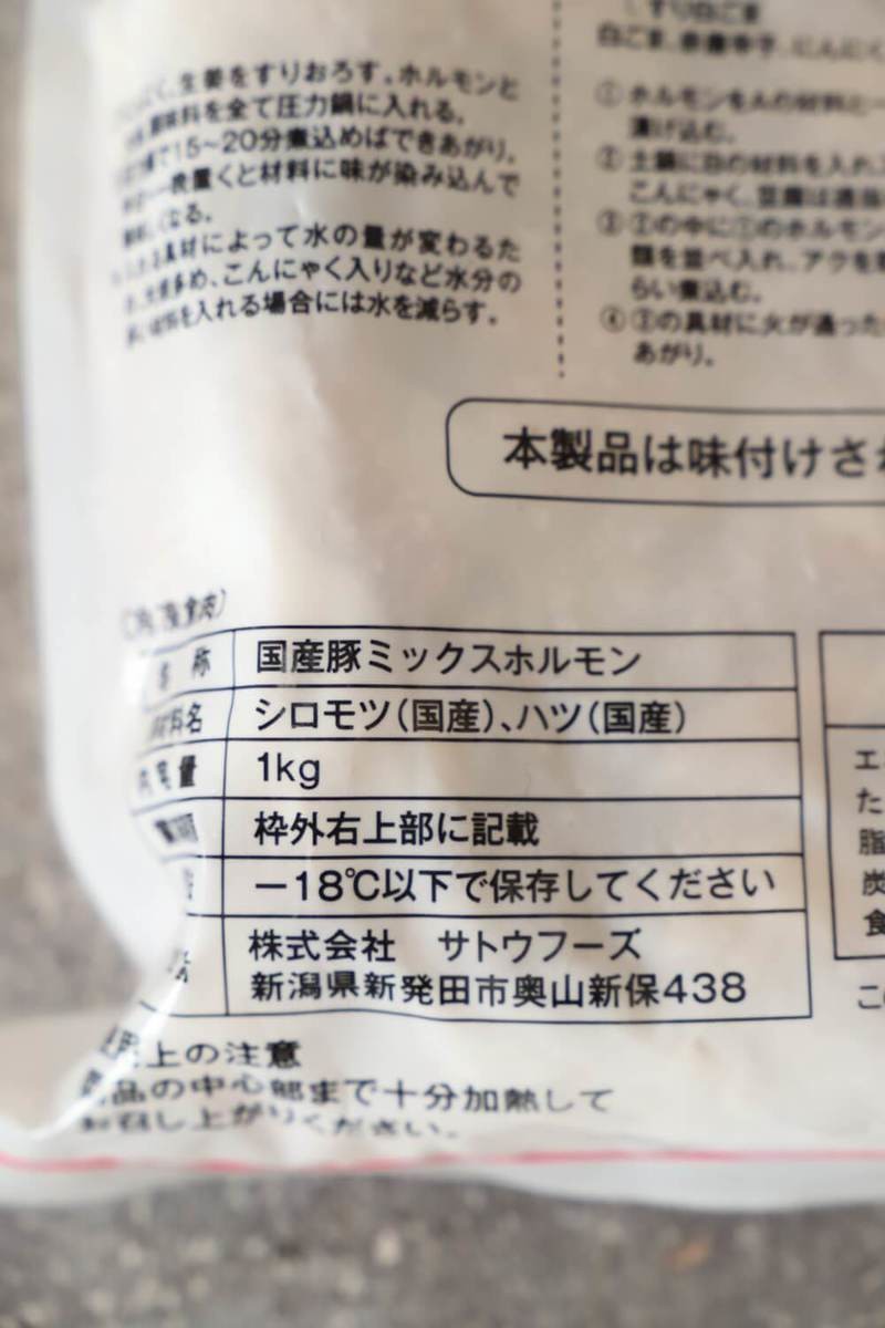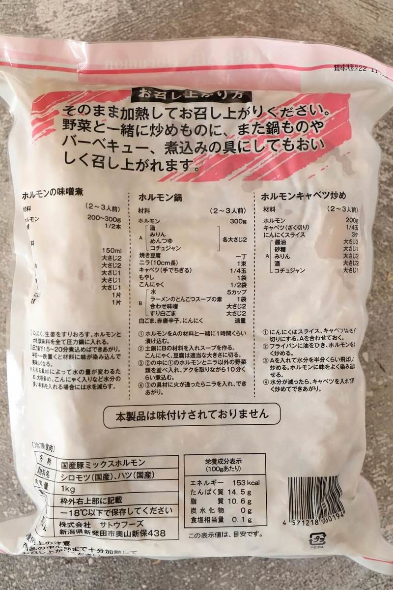 新潟県にある株式会社サトウフーズが製造しており、味付けがされていない国産のシロモツとハツがミックスされて入っています。