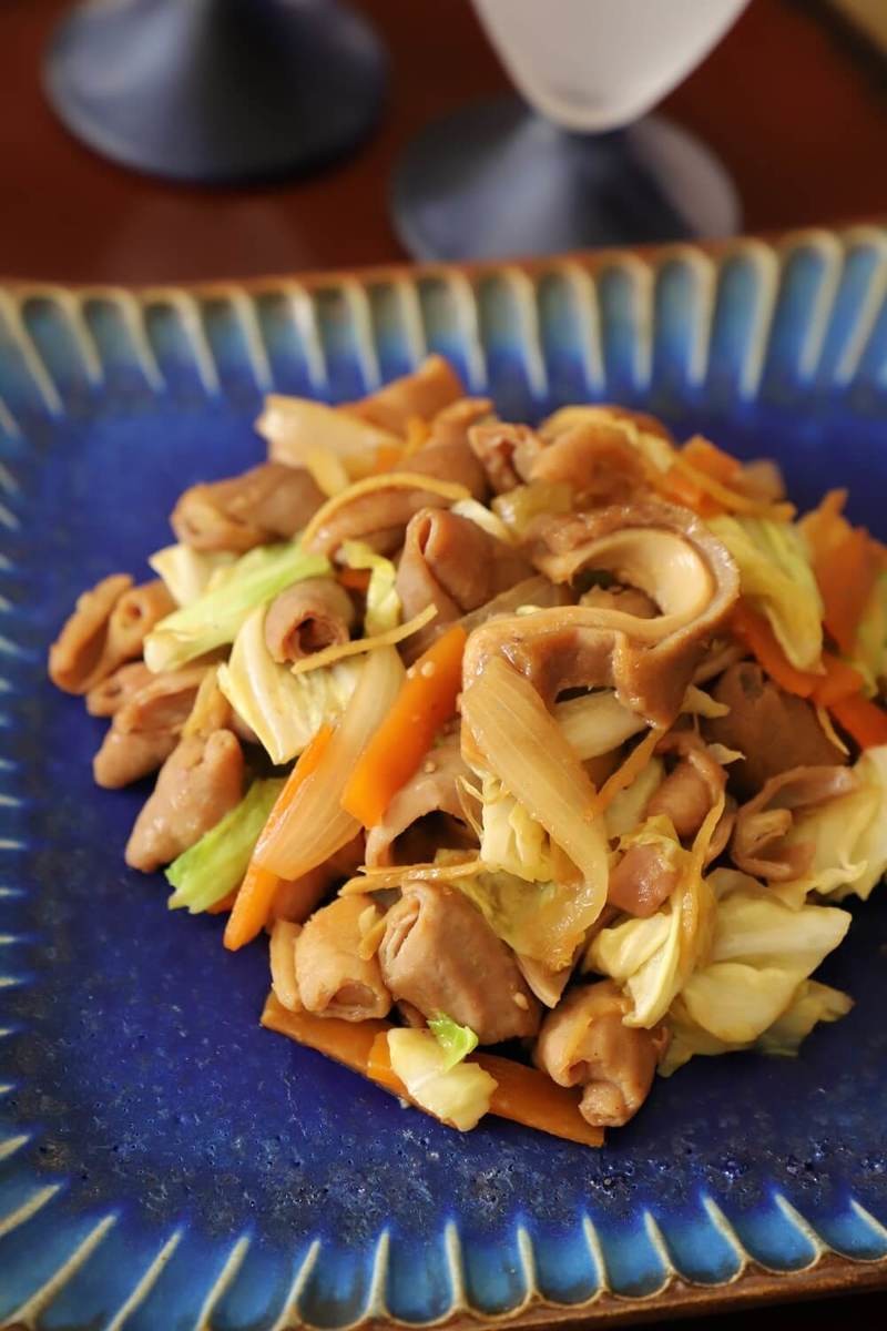 人参、玉ねぎ、生姜を炒め、そしてホルモンを炒めて火が通ったら最後にキャベツを入れます。