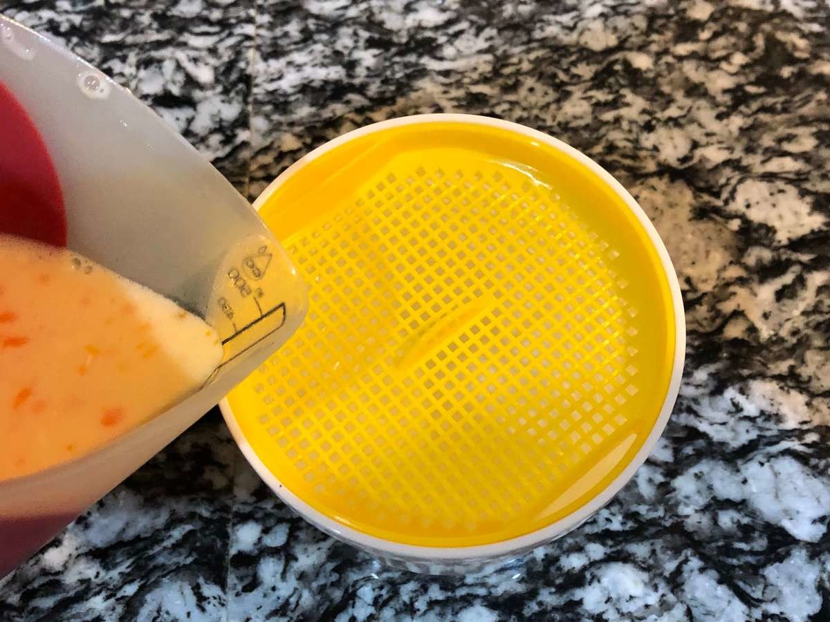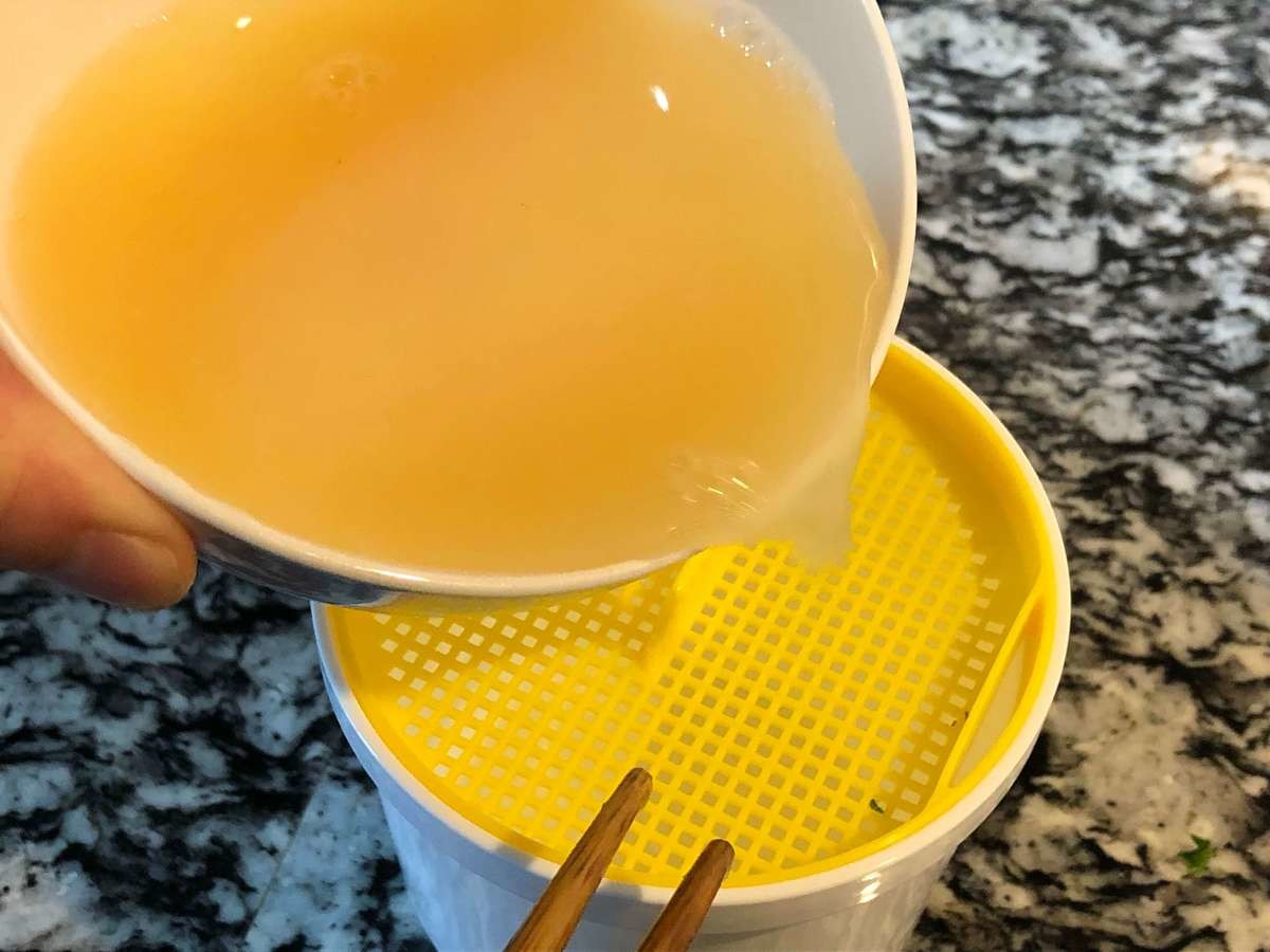 よく混ぜ合わせたら、網をセットして濾します。より滑らかな仕上がりにしたければ、2回ぐらいやる方がいいかな。