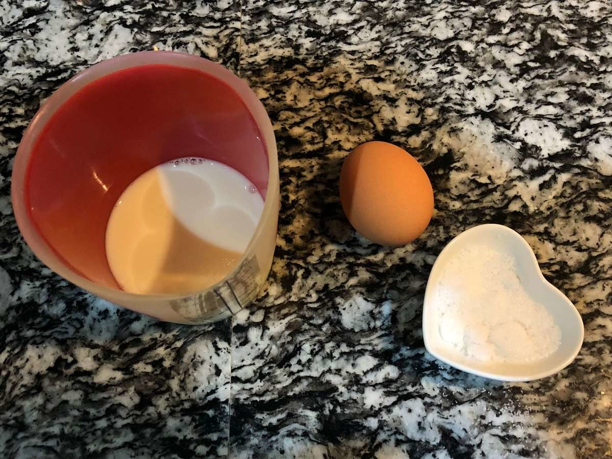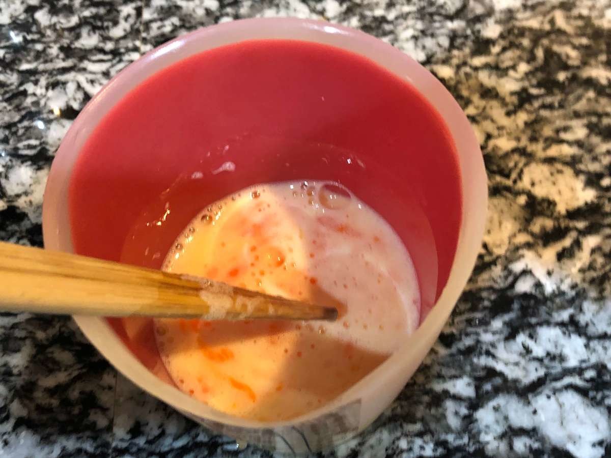 少し牛乳を冷まして卵を割り入れて混ぜます。この時牛乳が熱々だと卵が固まるので要注意。