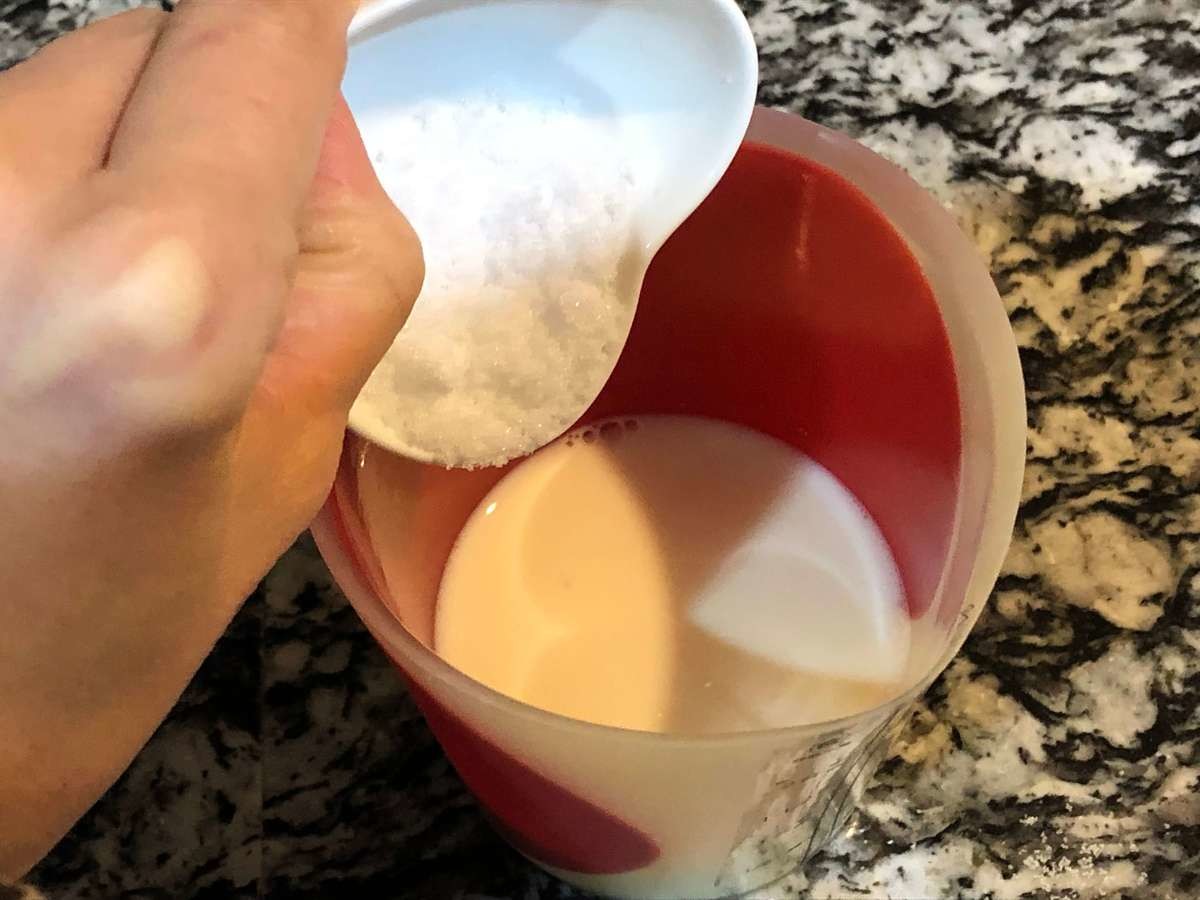 砂糖と牛乳を混ぜて電子レンジで1分半ほど加熱します。砂糖が溶けていればOKとします。